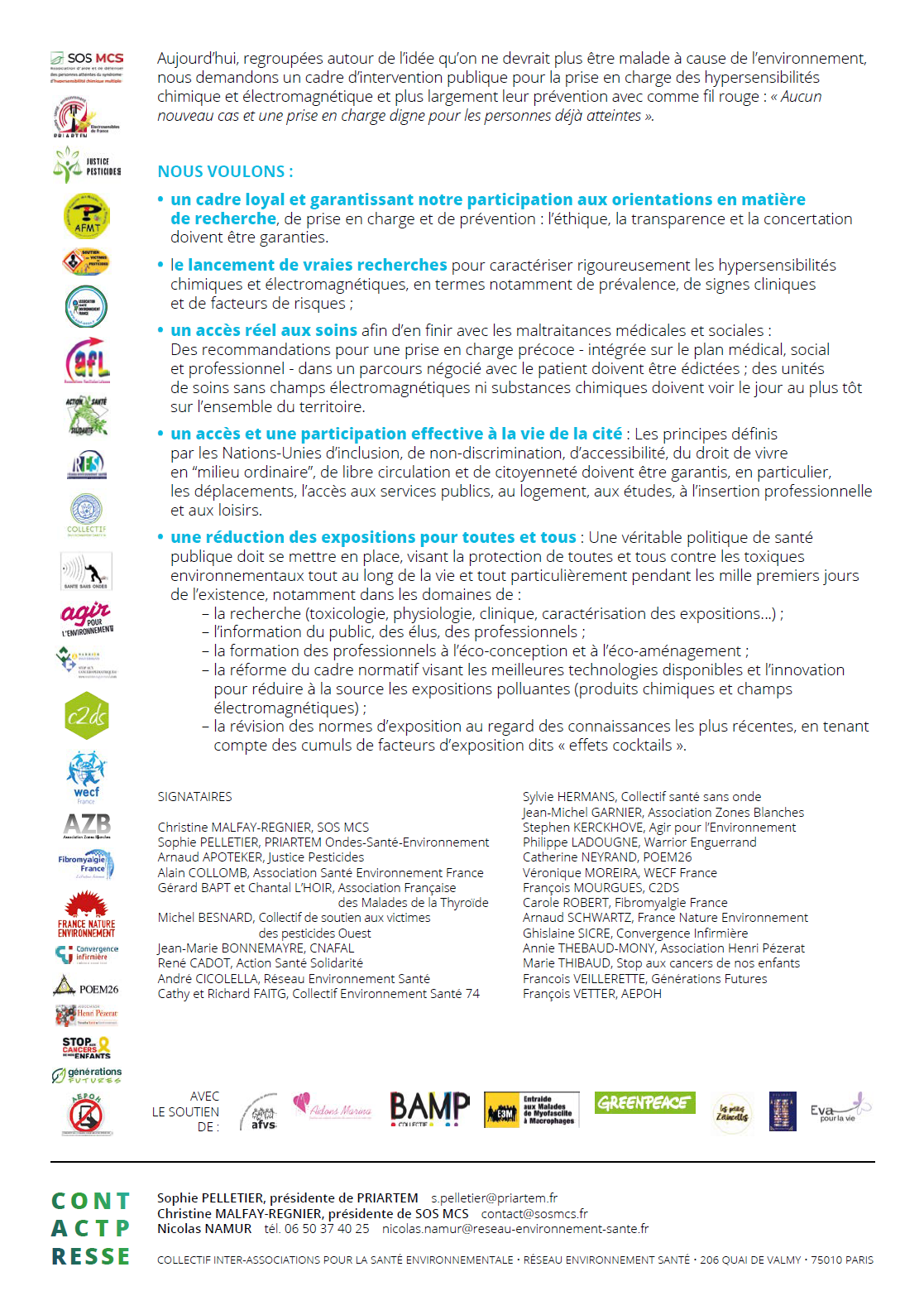 Faisant l’amer constat que l’État ne joue pas son rôle de protection en la matière mais au contraire encourage le développement tous azimuts de ce qu’il considère comme un progrès sans en évaluer les conséquences – passage en force sur la 5G, distances dérogatoires des épandages de pesticides proches des habitations, inaction quant à la pollution de l’air –, les signataires appellent à un engagement en vue des échéances électorales prochaines.