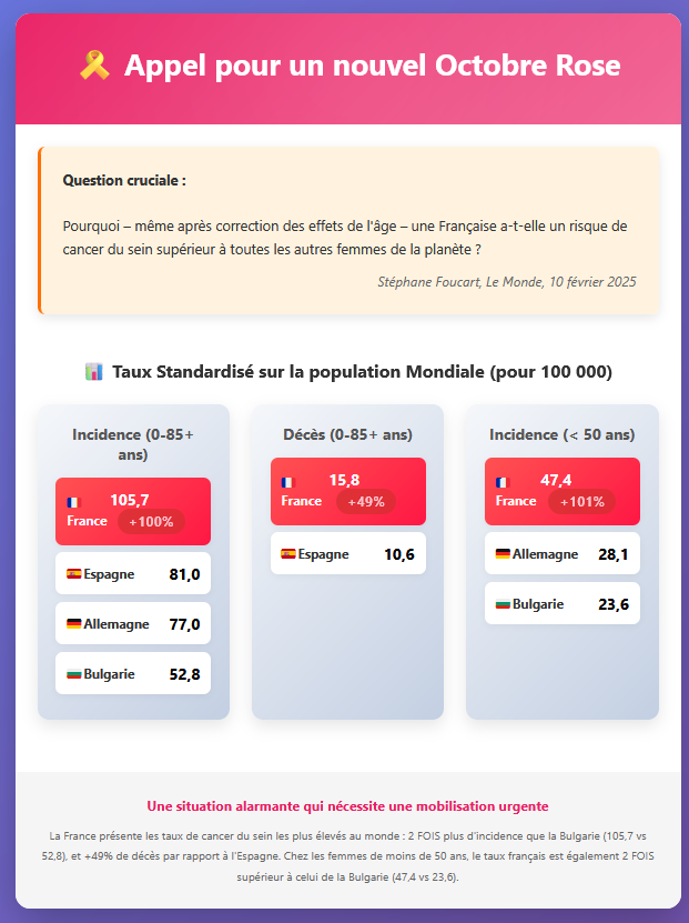 En effet, les données scientifiques montrent que seulement 10 % des cancers du sein sont d’origine génétique. Les 90 % restants sont liés à des facteurs environnementaux modifiables, aujourd’hui trop peu pris en compte dans les politiques de prévention.